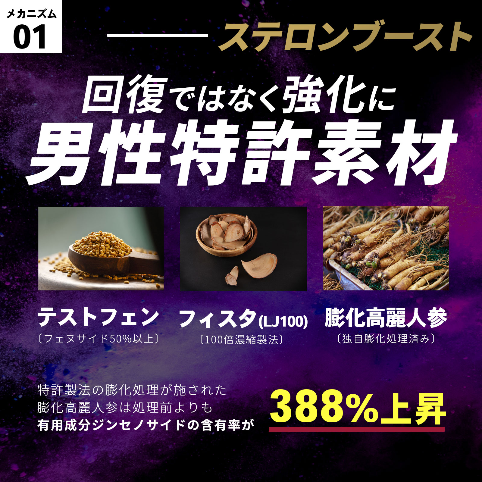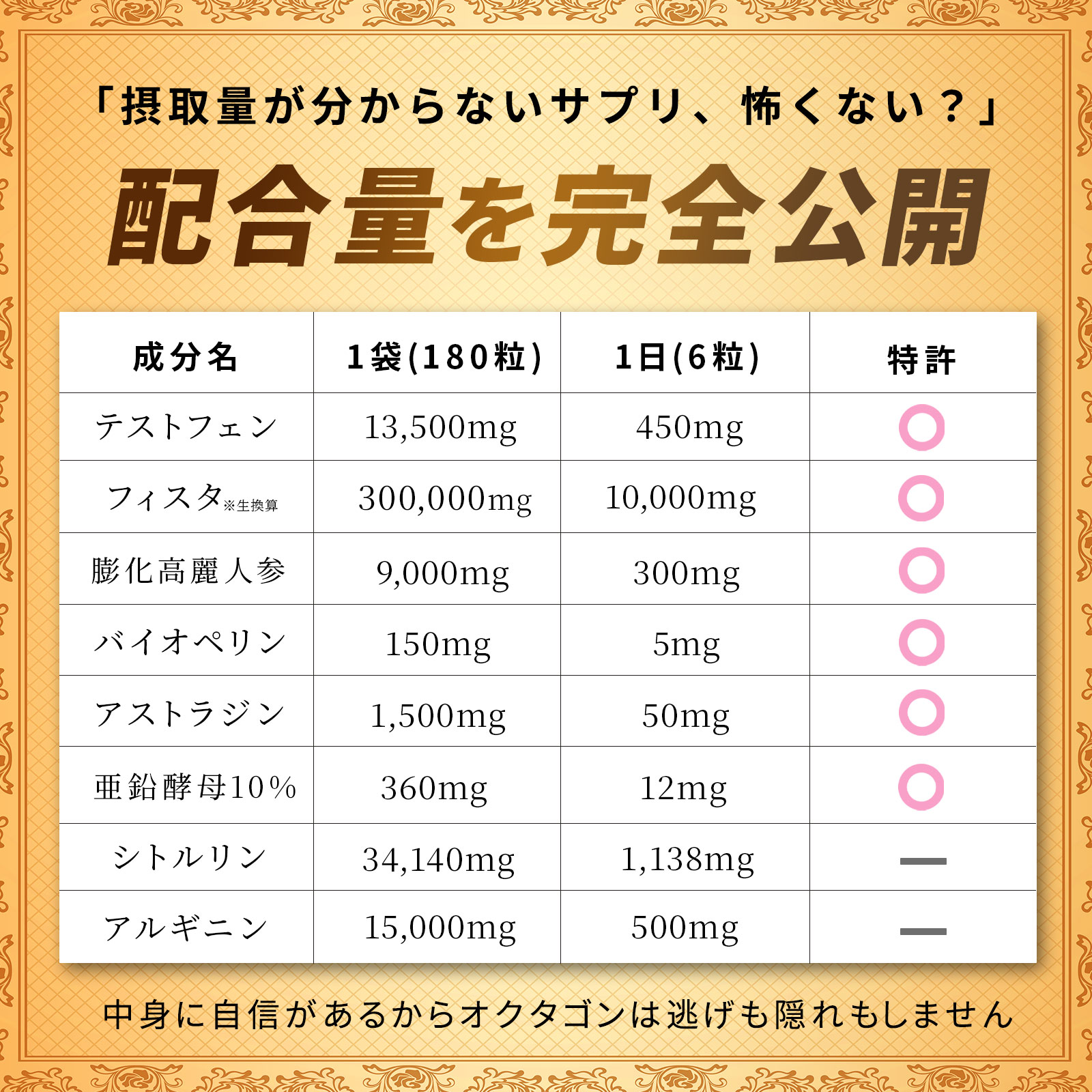 ✅ 【製品仕様】1袋180粒入り / 約30日分 / 6粒当たり含有成分 /テストフェン450mg/膨化紅参抽(300mg)/Physta(100mg)/アストラジン(キバナオオギ(茎・葉部分使用)、デンシチニンジン(茎・葉部分使用))(50mg)/バイオぺリン(5mg) /亜鉛酵母10%(12mg) /L-シトルリン(1,138mg)/L-アルギニン(500mg) ※本製品はL-シトルリン、L-アルギニンなどのアミノ酸成分の濃縮還元は行っておりません。